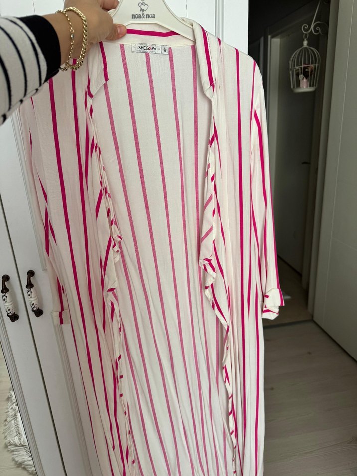 Pembe çizgili, tunik tariz ceket pamuk gibu bir kumaşı var 36 beden 38 bedenle giydim