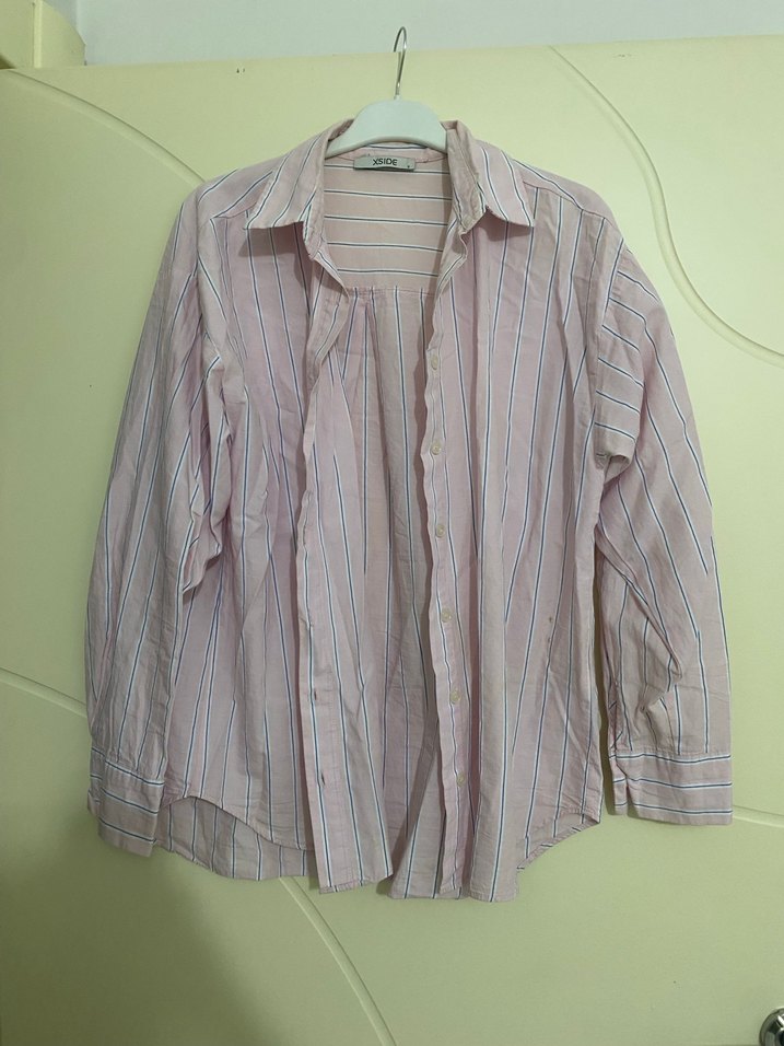 Uzun kollu, düğmeli ve yakalı bu kadın gömleği, gevşek kesim ve pastel pembe renkli çizgili desene sahiptir. Hafif keten kumaştan üretilmiştir, günlük rahat stil için uygundur.
