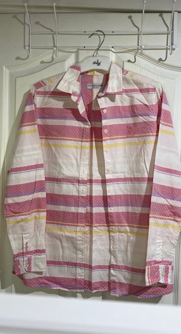 Pembe tonlarında çizgili, uzun kollu, yakalı ve düğmeli günlük kullanıma uygun rahat kesim gömlek.