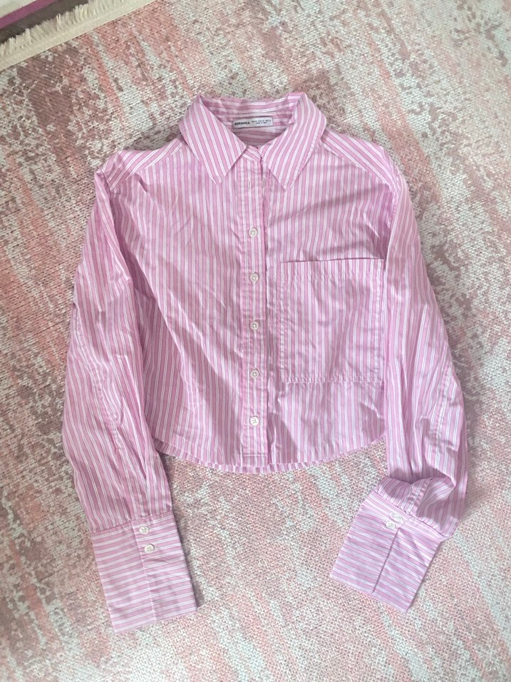 Pembe pastel tonlarda, uzun kollu, yakalı ve düğmeli ön kısmı olan gömlek. Rahat kesimi, normal midi boyu ve çizgili deseniyle pamuklu yumuşak kumaştan üretilmiştir. Trendy günlük stil için uygundur.