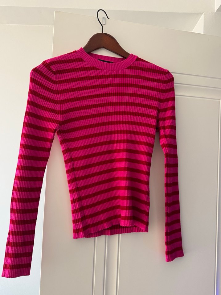 Pembe ve koyu pembe çizgili, uzun kollu, ince ve fitted kesim kadın kazak. Örgü kumaştan, günlük kullanıma uygun rahat bir sokak stili sunar.