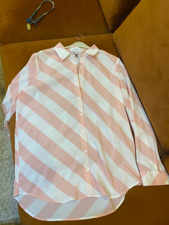 Pembe çizgili bu gömlek uzun kollu, yakalı ve düğmeli ön yapıya sahiptir. Normal kesim ve midi boyda, yumuşak sentetik kumaştan üretilmiştir. Günlük kullanım için uygundur.