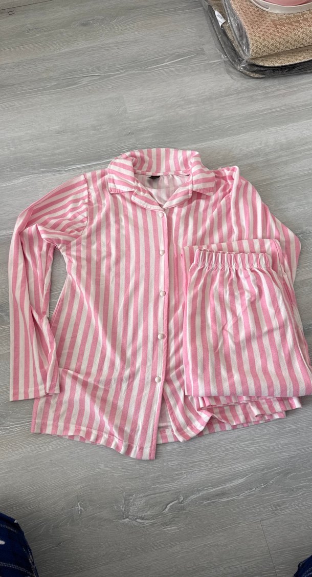 Pembe ve beyaz çizgili, uzun kollu, bol kesim kadın pijama takımı.