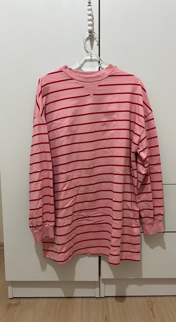 Pamuklu kumaştan, uzun kollu ve bisiklet yaka olan bu pembe çizgili sweatshirt, rahat ve midi boydadır. Günlük kullanıma uygun, salaş kesimli ve sokak stiliyle uyumludur.