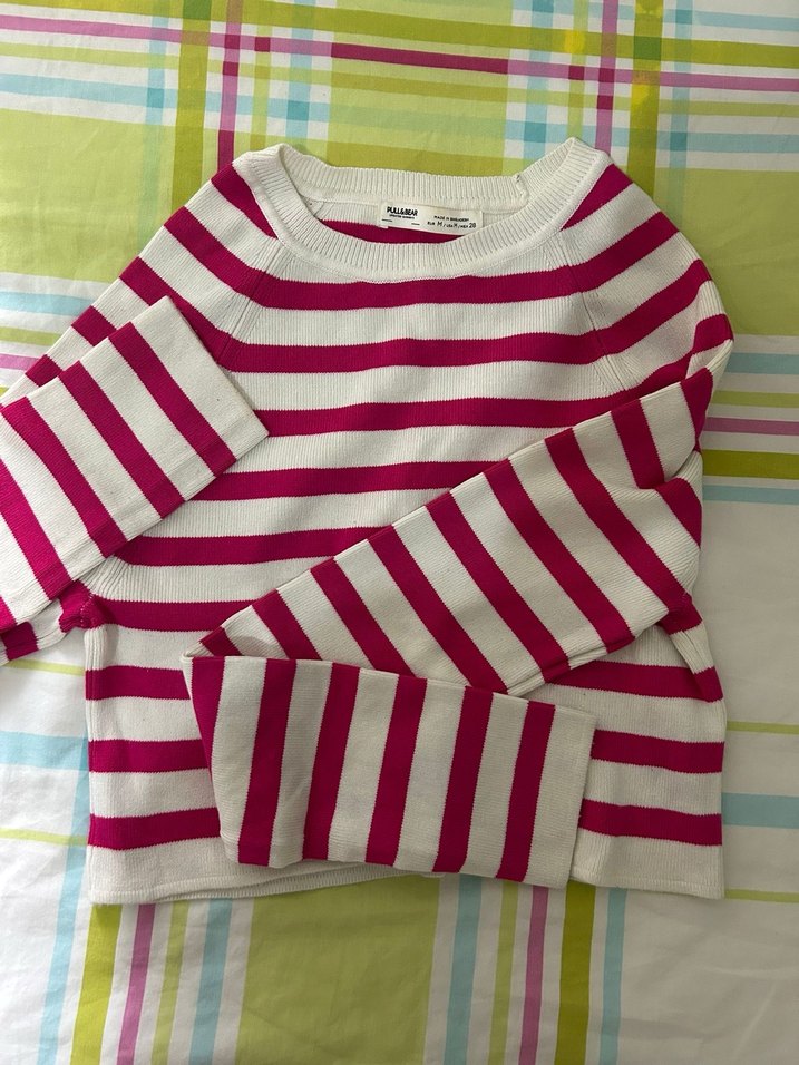 Pamuklu, pembe-beyaz çizgili, uzun kollu, tekne yaka ve dar kesim kadın triko. hiç kullanılmadı