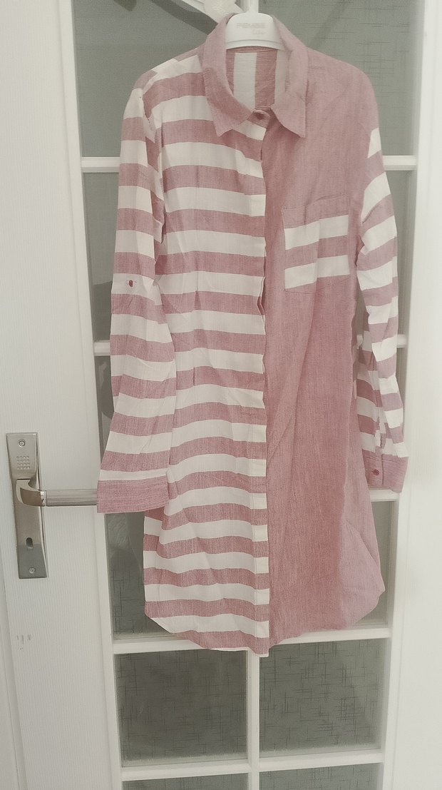 Pembe keten gömlek, uzun kollu ve bol kesimdir. Drapeli tasarımı, yakalı ve çizgili deseniyle günlük rahat kullanıma uygundur.