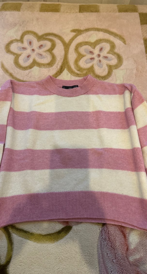 Pembe ve beyaz çizgili, uzun kollu, yuvarlak yakalı, rahat kesim triko kazak. Günlük kullanıma uygun, konforlu ve şık.