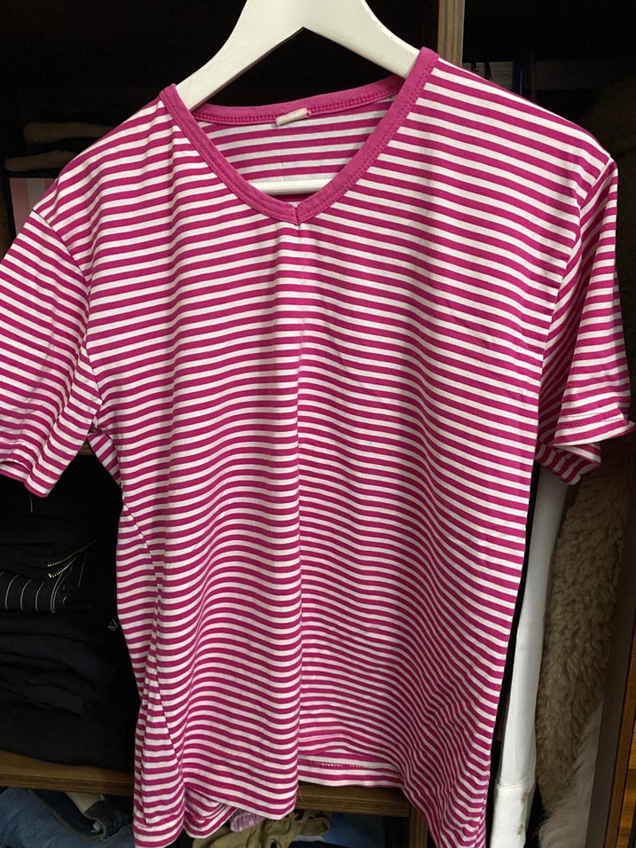 Renkli pembe çizgili kadın tişörtü, kısa kollu ve V yakalıdır. Sentetik kumaştan yapılmış, rahat ve salaş kesimiyle günlük kullanıma uygundur.
