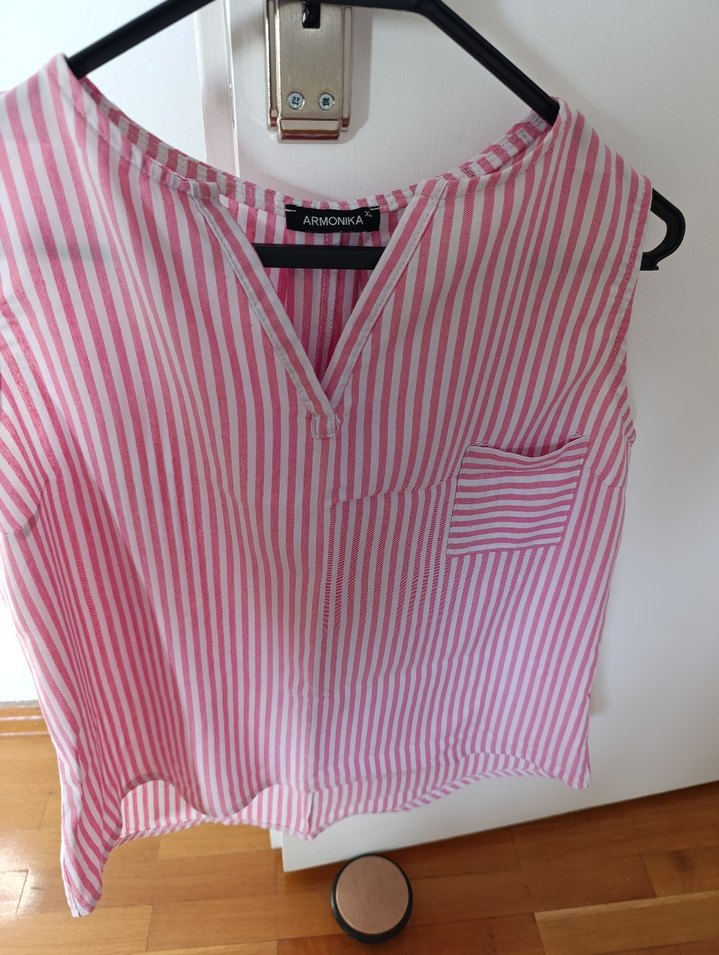 Pamuklu, hafif pembe renkli, çizgili ve kolsuz kadın gömleği. V yaka ve düğmeli detaylara sahip, rahat kesimdir. Günlük kullanıma uygundur.