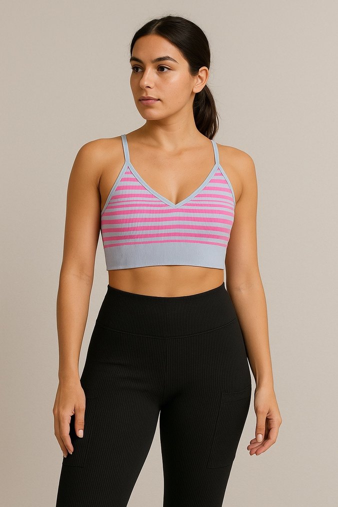 Pembe çizgili, V yakalı ve ince askılı, vücuda oturan bu crop top, hafif sentetik kumaştan yapılmıştır. Spor ve günlük kullanıma uygundur. ✨