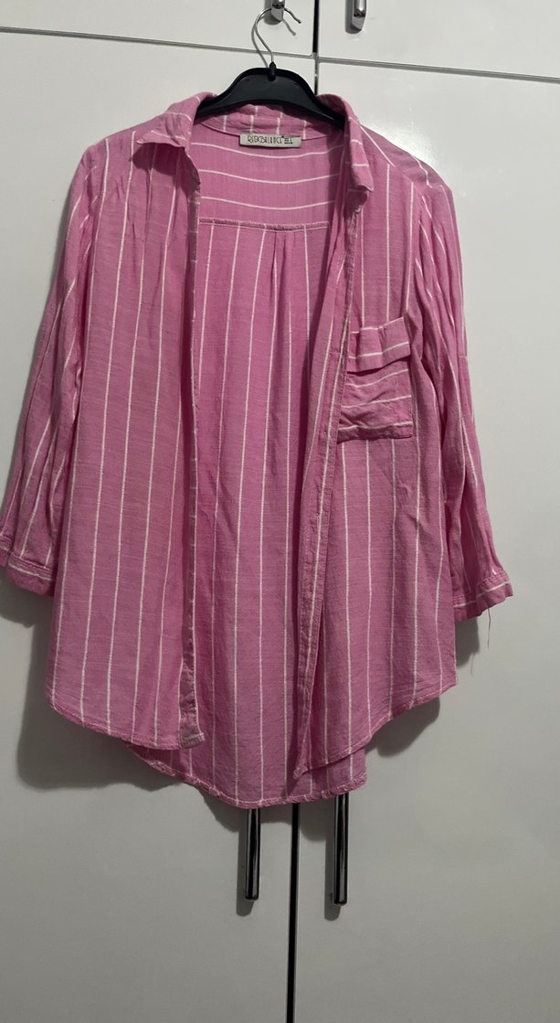 Pembe çizgili keten gömlek, uzun kollu ve V yakalıdır. Düğmeli, bol kesim ve günlük kullanıma uygun bohem tarzda.
