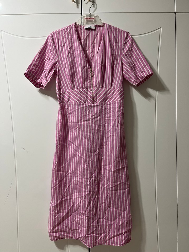 Pembe çizgili, kısa kollu ve V yakalı uzun elbise. Düğmeli ön kısmı ve pastel tonlarıyla bohem tarzda, günlük kullanıma uygun. Az kullanılmıştır. 38-42 bedene uyumludur.