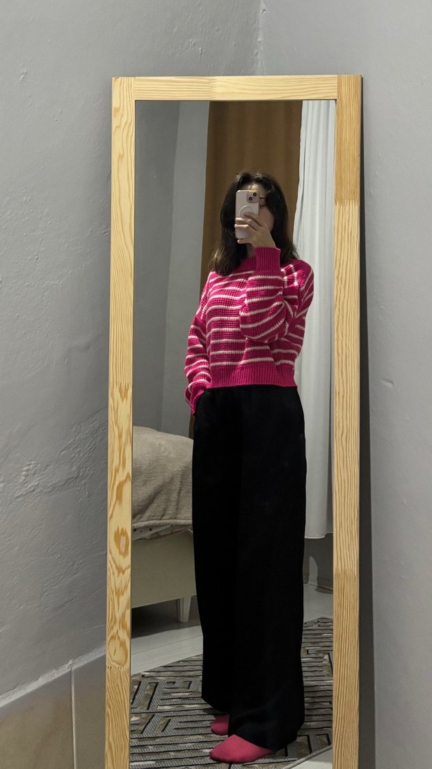 Uzun kollu, yüksek yakalı, pembe çizgili örgü kazak. Salaş kesimi ve midi boyu ile günlük kullanıma uygun rahat bir parça.