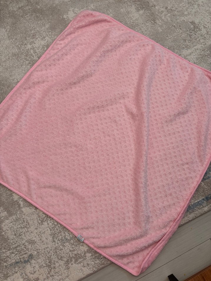 Sentetik kumaştan yapılmış, desensiz ve yumuşak pembe çocuk battaniyesi. Ölçüsü 90cm-100 cm şeklinde