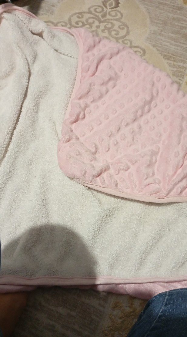 Pastel pembe renkte, yumuşak ve kabarık dokulu çocuk battaniyesidir. Düz ve kabartmalı yüzeyi ile sıcak tutar.
