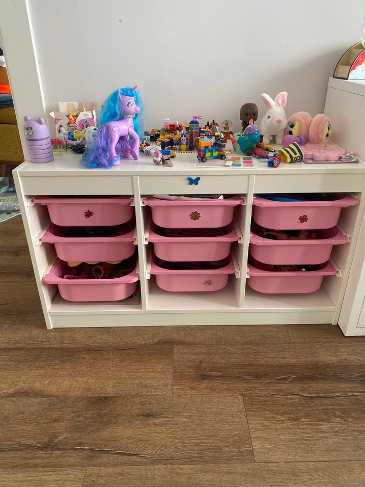 Beyaz çerçevede dokuz adet açık pembe saklama kutusu bulunan çocuk dolabı, oyuncak ve aksesuarlar için düzenli alan sağlar.