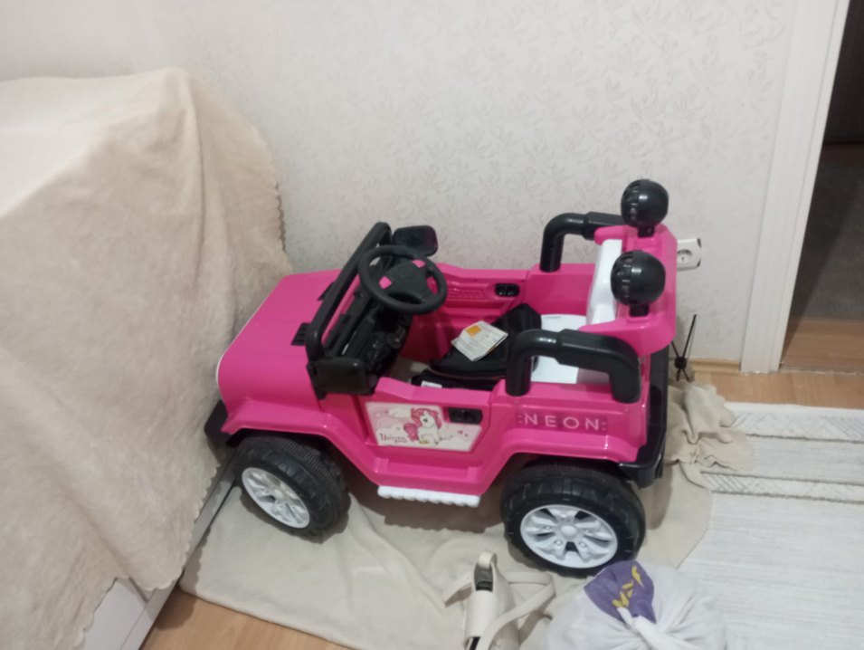 Sayılı kullanıldı. Pembe renkte, renkli tasarıma sahip elektrikli oyuncak araba.