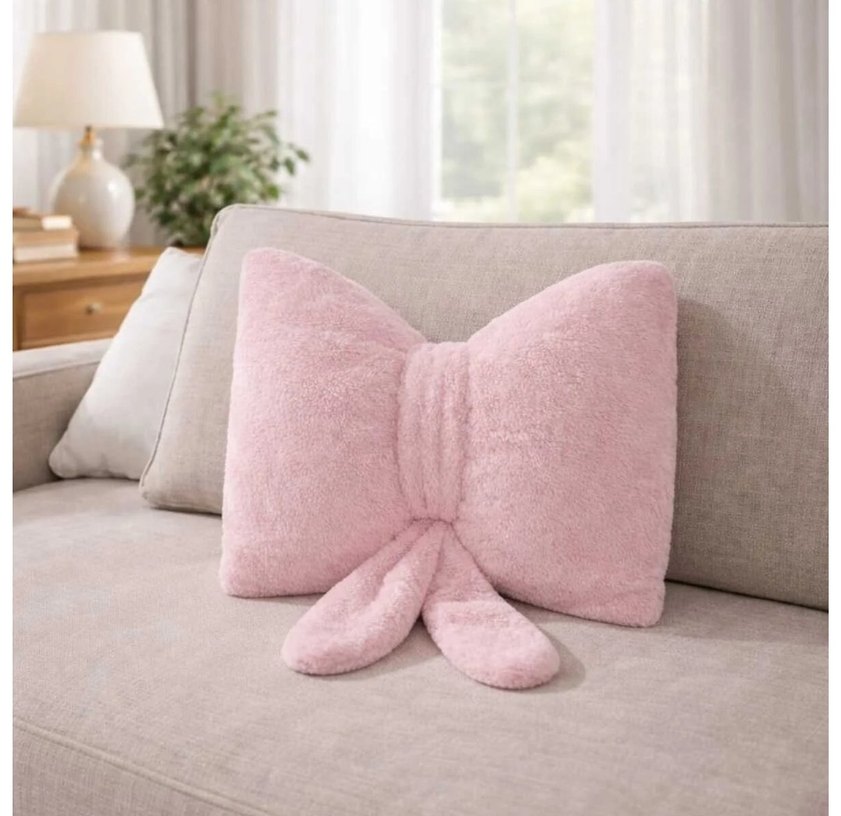 Yumuşak ve sıcak kumaştan yapılmış, fiyonk şeklinde pembe çocuk yastığı. Pastel rengiyle odalara nazik bir dokunuş katar.