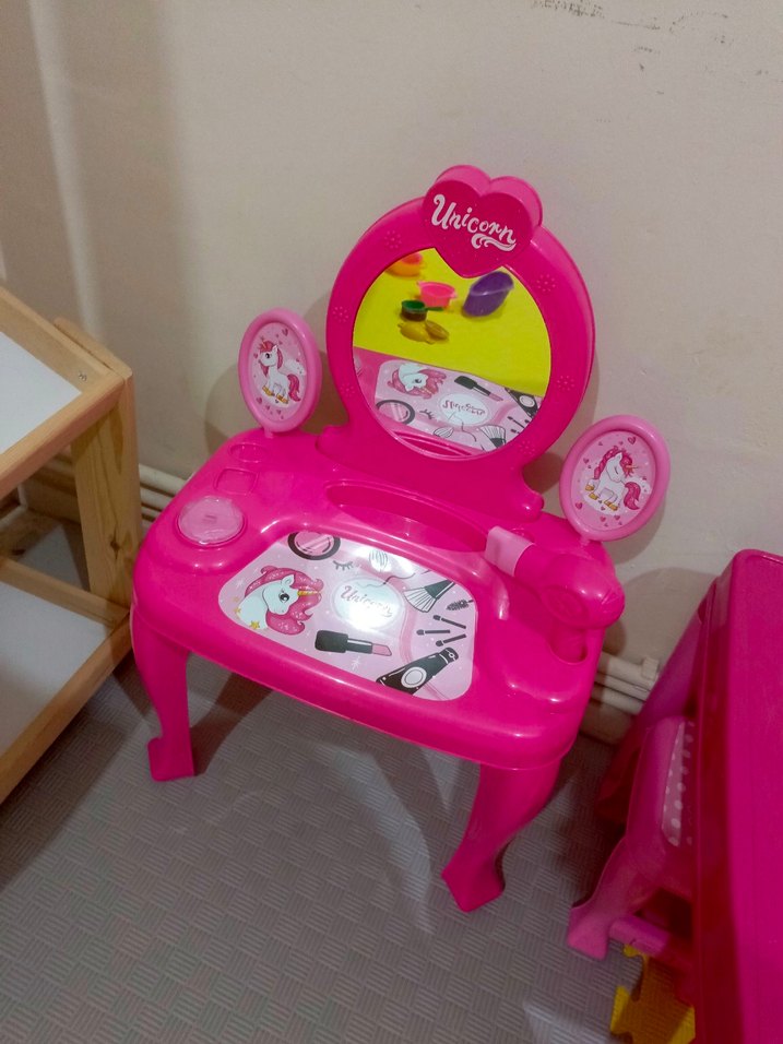 Pembe renkli, unicorn temalı çocuk makyaj masası, aynalı ve eğlenceli detaylara sahip.