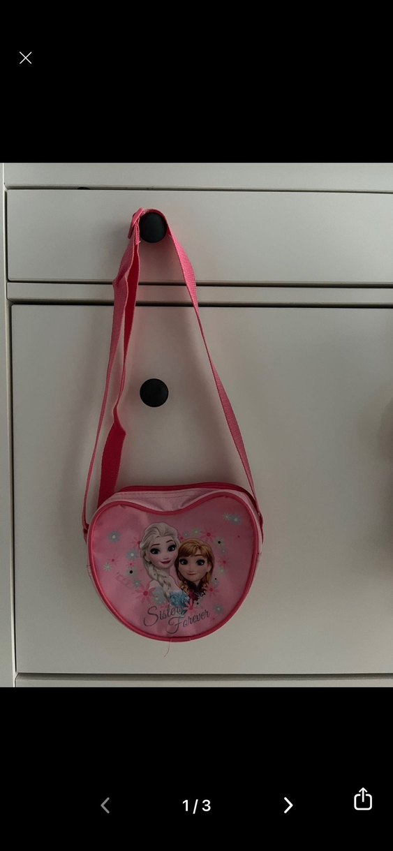 Ayarlanabilir askılı pembe çocuk okul çantası, önünde renkli Frozen temalı desen bulunur. Küçük eşyalar için uygundur.