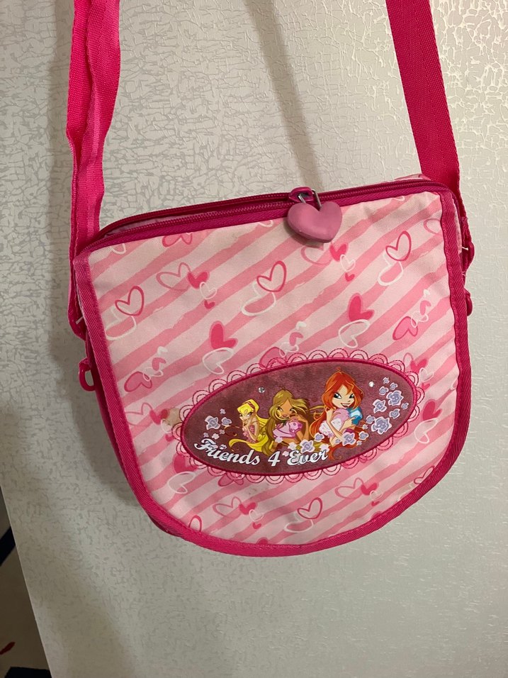 Renkli kalp desenleri ve kalp şeklinde fermuar çekici olan pembe çocuk okul çantası. 'Friends 4 Ever' karakterli baskıya sahip. Çift taraflı kapak kullanımı mevcut