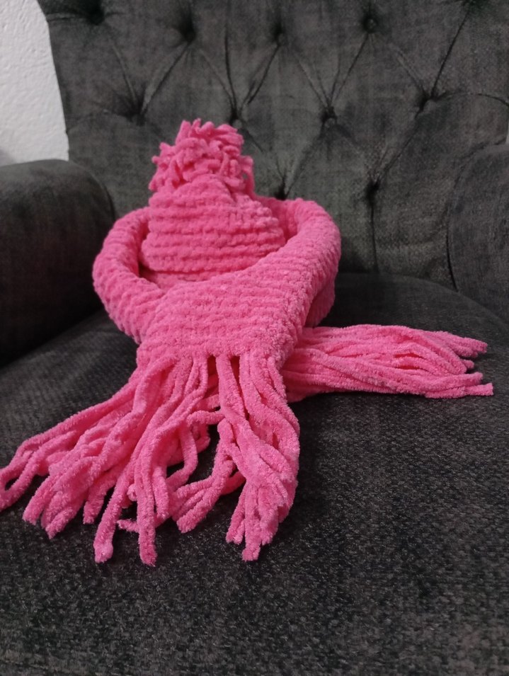 Püsküllü pembe atkı ve ponponlu bere içeren örgü çocuk seti.
