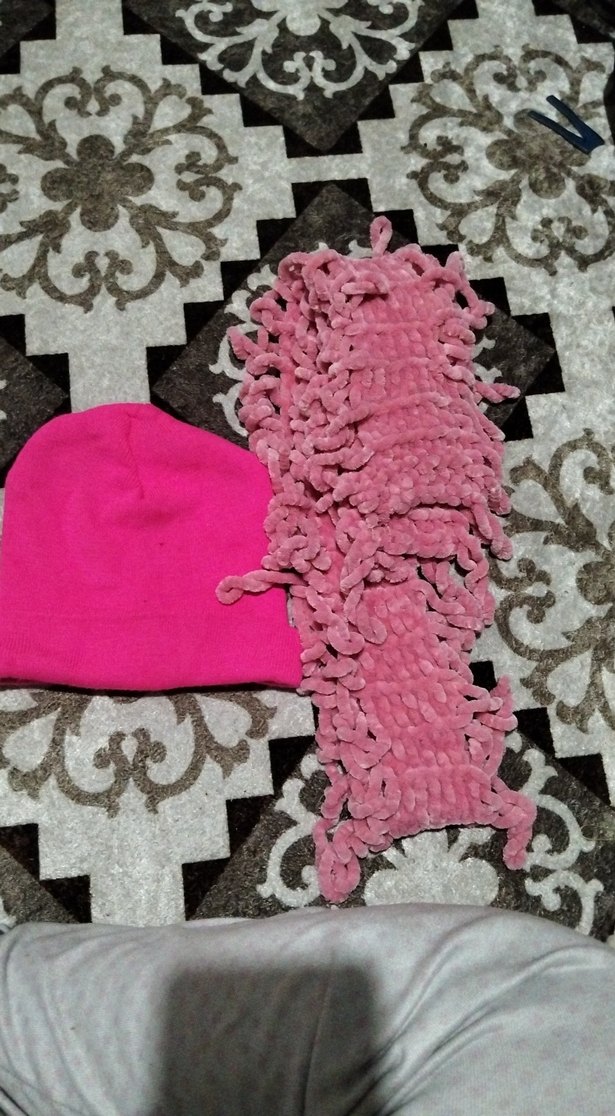 Renkli pembe örgüden yapılmış, yumuşak bere ve dokulu atkıdan oluşan çocuk takımı.