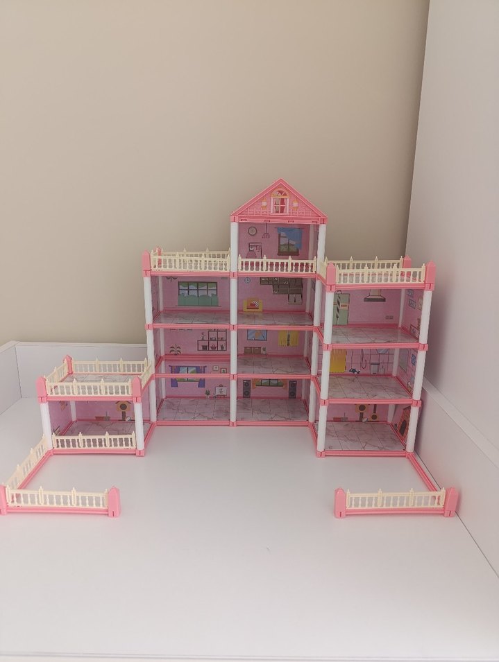 Çok katlı ve balkonlu açık pembe çocuk oyun evi mobilyasıdır. Çıkarılabilir çitler içerir. içindeki oyuncaklar mevcut kutuda göründüğü gibi hiç kullanılmadı