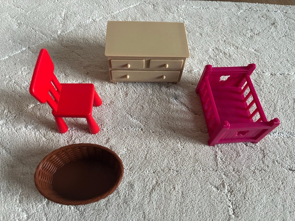 Bu çocuk oyun mobilyası seti, pembe bir yatak, çekmeceli bej bir şifonyer, kırmızı bir masa ve kahverengi bir sepet içerir. Hayal gücü oyunları için uygundur. ️