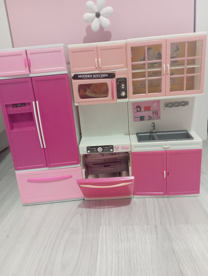 Pembe oyuncak mutfak seti; buzdolabı, fırın, mikrodalga ve lavabo içerir. "MODERN KITCHEN" yazısı bulunur.