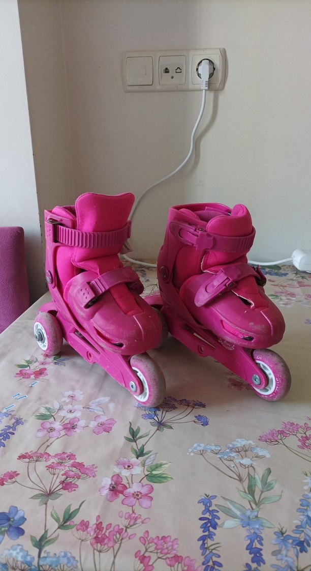Ayarlanabilir kayışlı pembe çocuk patenleri, renkli ve kolay kullanım için tasarlanmıştır. 27 ve 30 numara arası uygundur numara ayarlaması yapılmaktadır