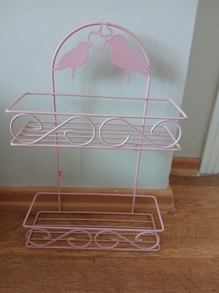Pastel pembe renkte, kuş figürlü çocuk rafı. Metalden yapılmış, iki katlı depolama alanı sağlar.