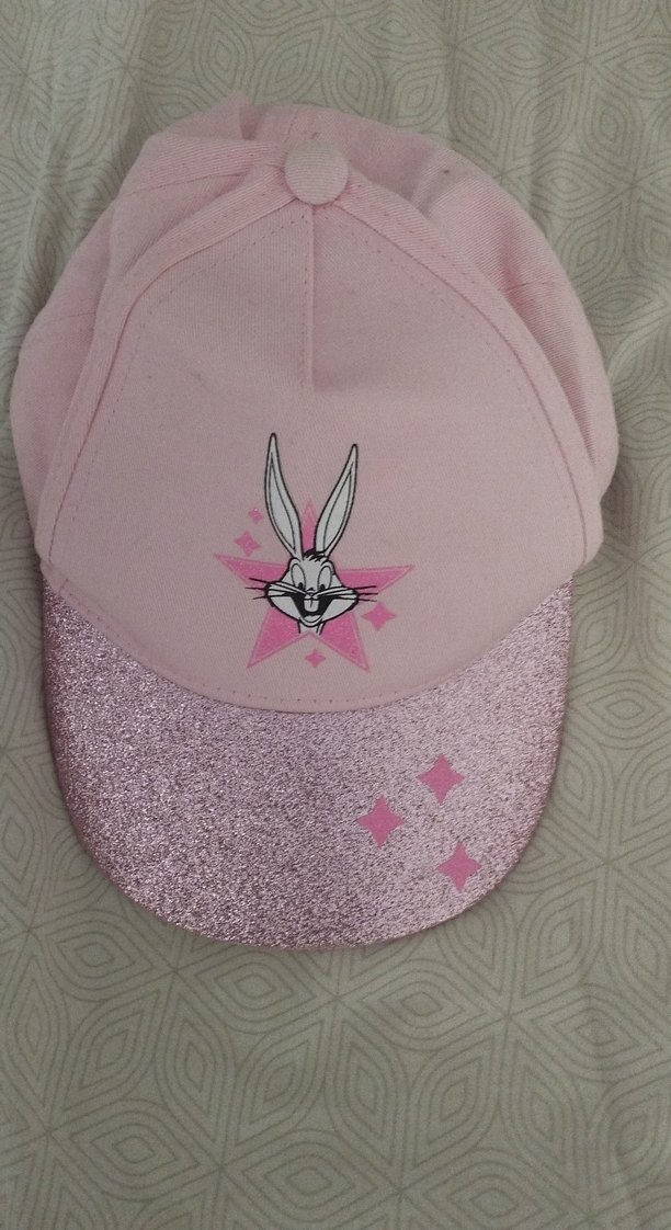 Pastel pembe çocuk şapka, işlemeli Bugs Bunny desenli ve ışıltılı simli vizöre sahip. Ayarlanabilir cırt cırtlı bant içerir.