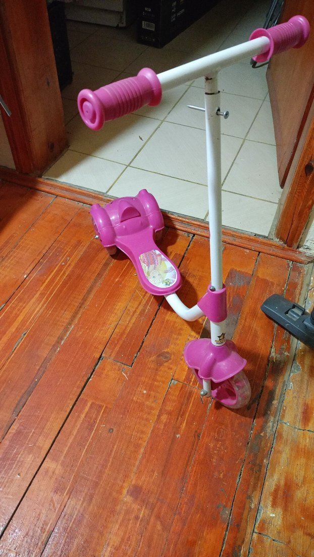Renkli pembe tasarıma sahip çocuk scooter'ı, sağlam yapısı ve rahat tutacakları ile küçük sürücüler için uygun. herhangi bir sorunu yok sadece evde sürüldü