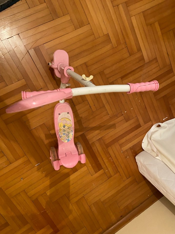 Pastel pembe renkte, çocuklar için tasarlanmış dayanıklı scooter. Rahat tutma sapları ve dengeli geniş tabanlıdır.
