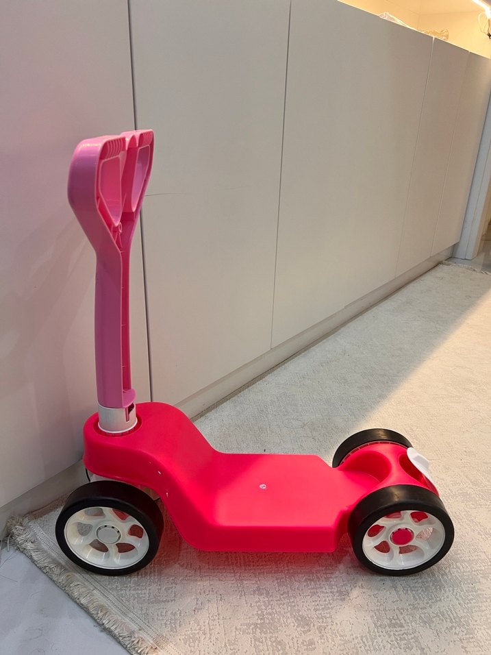 Renkli pembe çocuk scooter'ı, sağlam taban ve dört tekerlekle dengeli sürüş sağlar. Kontrol ve denge için tutacağı vardır.