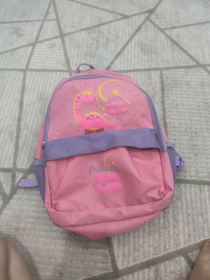 Pastel pembede dinozor desenli çocuk okul çantası, ayarlanabilir askılar ve çoklu bölmeler içerir. ilk okul icin uygun ust kisimda biraz sokugu var dikilirse hirbir sorunu kalmaz