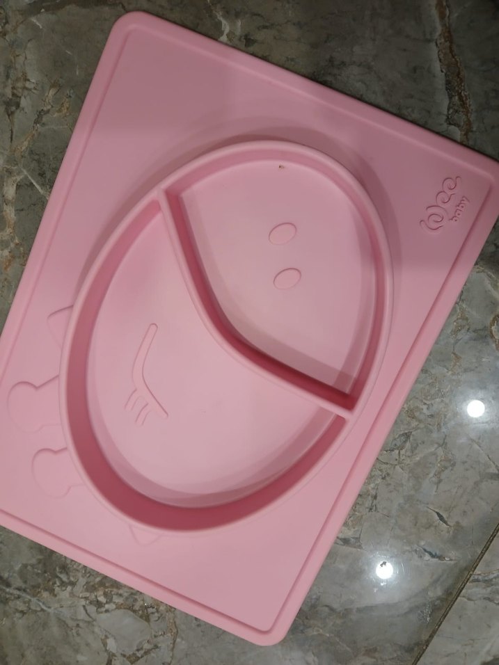 Pastel pembe renkte, bölmeli çocuk tabağı, yemekleri kolayca ayırmak için idealdir. ️hic kullanilmadi, kaymaz,weebaby marka