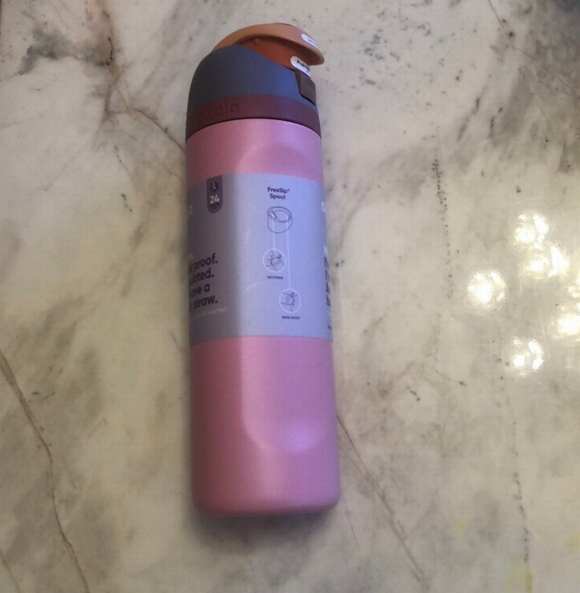 Pembe pastel renkte, çocuklar için dökülmez kapaklı ve düğmeli pipetli termos matara. İçecekleri sıcak veya soğuk tutar.