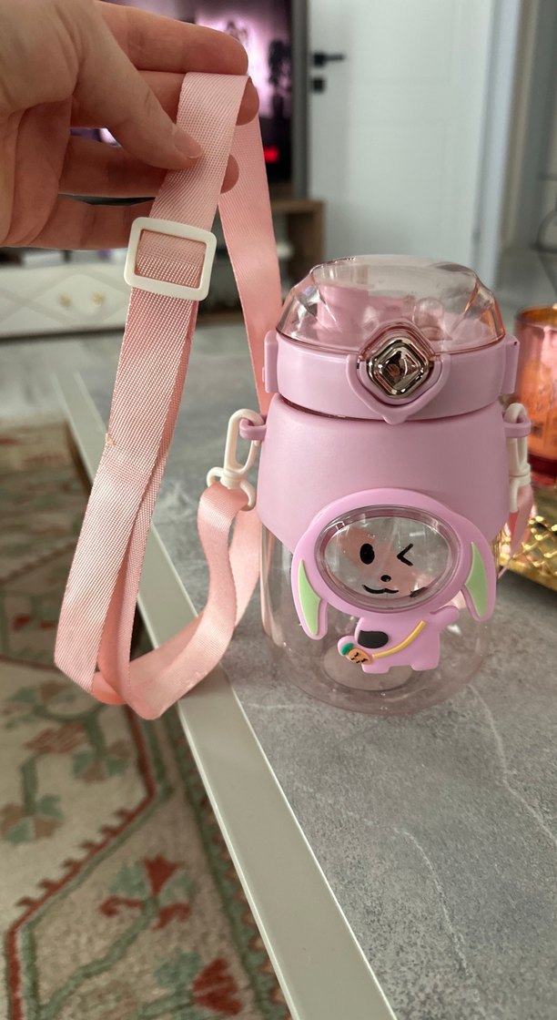 Pembe renkli çocuk termos şişesi, sevimli karakter tasarımı ve ayarlanabilir taşıma askısı ile kullanışlıdır. Şeffaf taban ve güvenli kapak bulunur.