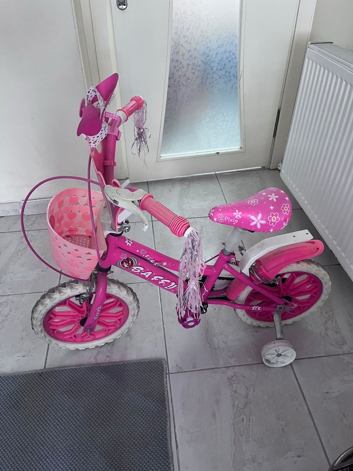 Pembe renkli, ön sepetli ve saplarında süs püskülleri bulunan çocuk üç tekerlekli bisiklet. Eğlenceli bir uçurtma pervanesi mevcuttur.