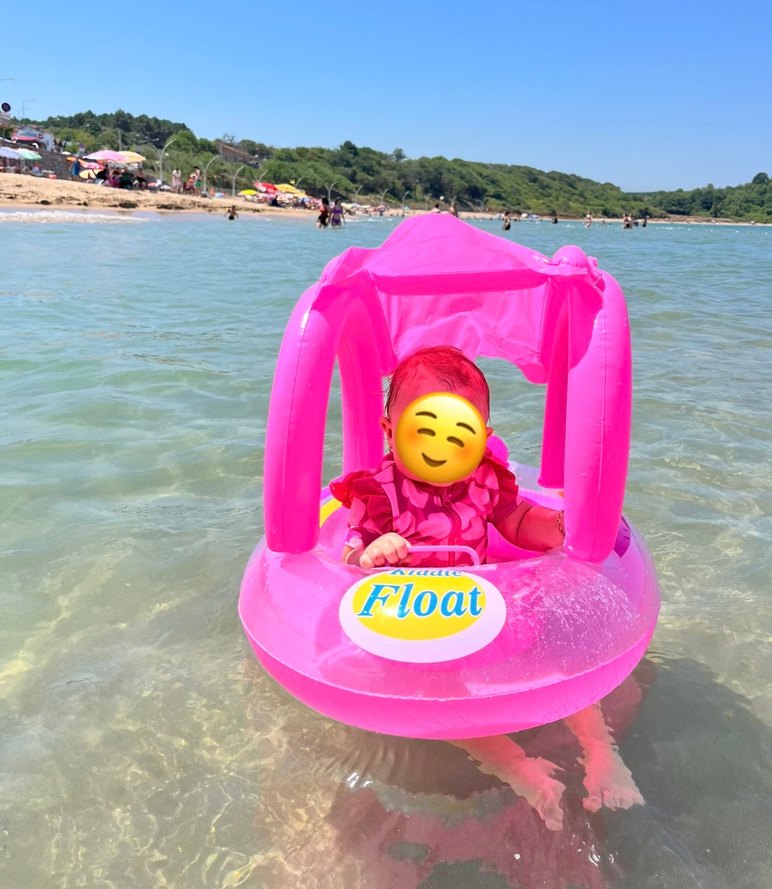 Çocuklar için gölgelikli, renkli pembe yüzme simidi. Su içinde gölge ve destek sağlar. ️