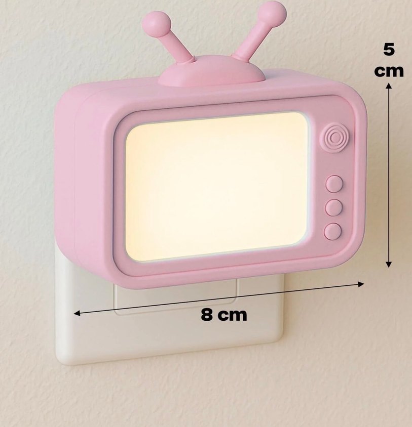 Pembe renkli, eski tarz TV şeklinde çocuklar için gece lambasıdır. Yaklaşık 8 cm ölçüsünde olup duvar prizine takılarak yumuşak ışık verir.