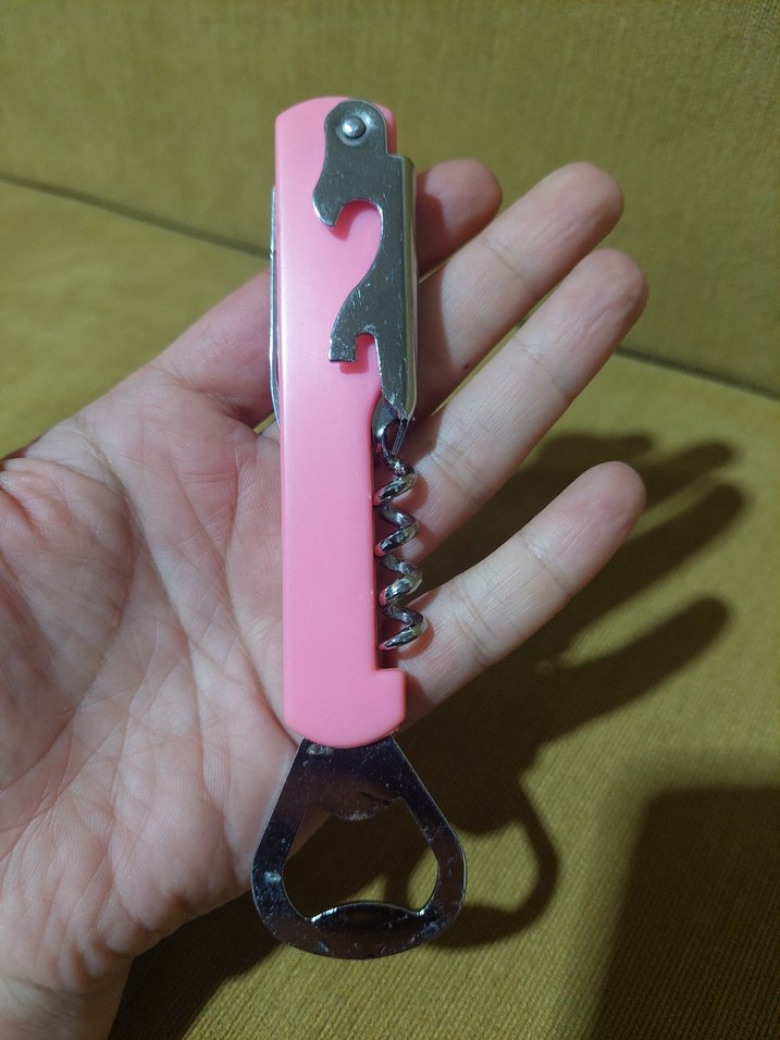 Pembe renkli bu çok fonksiyonlu açacak, şişe açacağı, tirbuşon ve kutu açacağı özelliklerini bir arada sunar. Canlı ve kullanışlı tasarıma sahiptir.