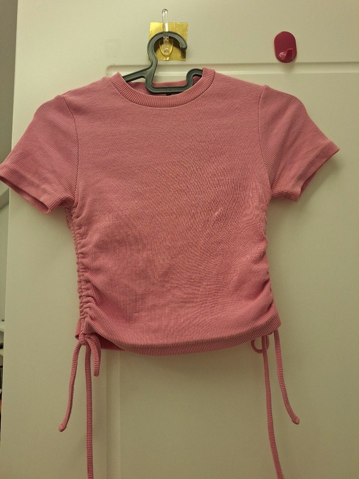 Pudra rengi, kısa kollu, fit kesim . Yumuşak keten kumaştan, yanlarda ayarlanabilir büzgü detaylıdır.