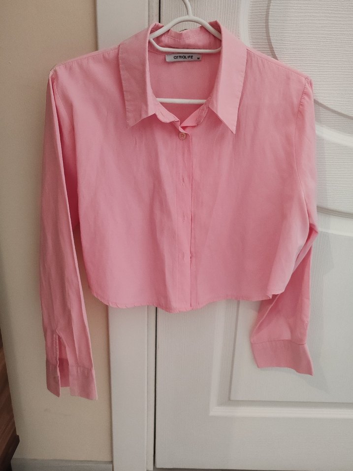 Pastel pembe gömlek, yakalı ve düğmeli. Uzun kollu, crop. Hiç bir sorunu yok. M beden ama s giyenler de rahatlıkla kullanabilir ✨