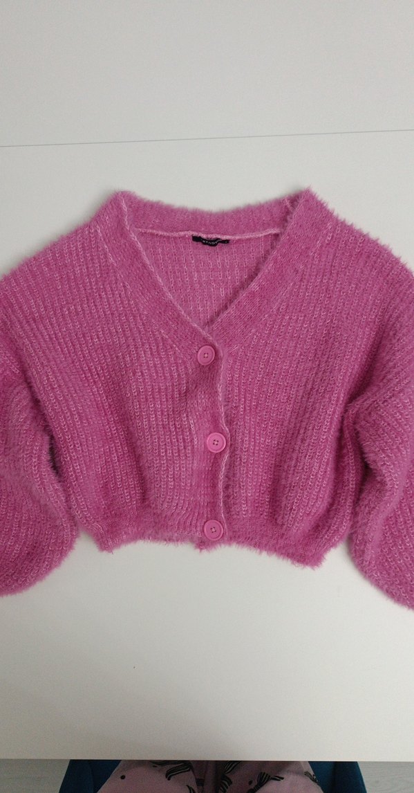 Pembe renkli, uzun kollu, yuvarlak yakalı, bol kesim örgü kadın hırka. Yumuşak dokulu ve desensiz, günlük kullanım için uygundur.