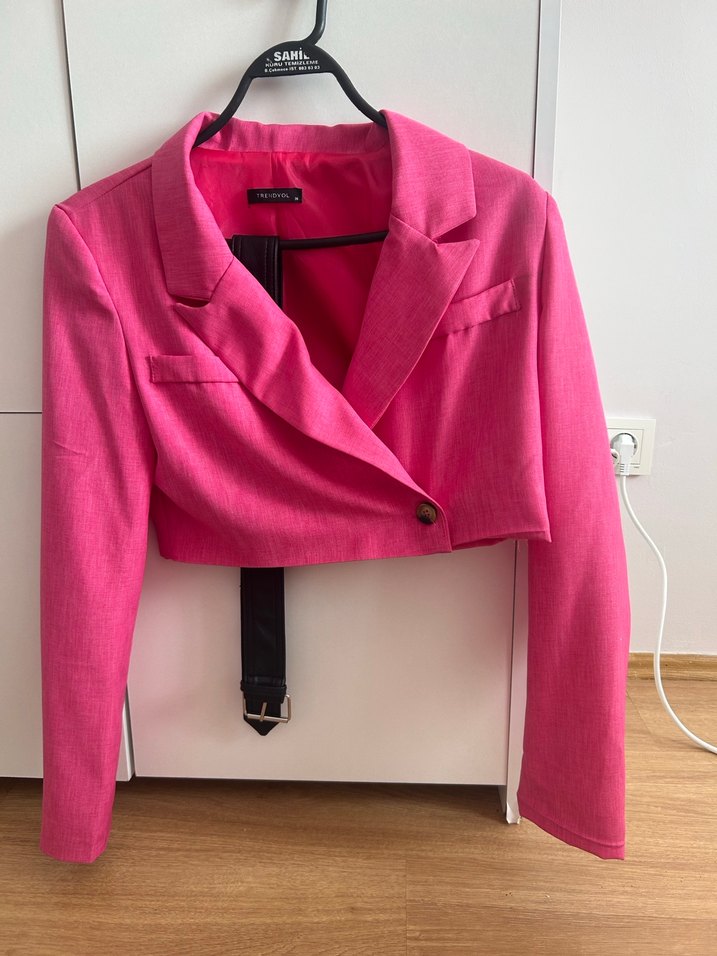 Pembe renkte, kemerli ve tek düğmeli kısa blazer ceket. Sentetik kumaştan, regular fit ve strappy kollu, ofis ve günlük kullanım için uygundur. S M bedene olur Crop boy kısa bel hizasında olur 1 kere fotoğraf için giyildi