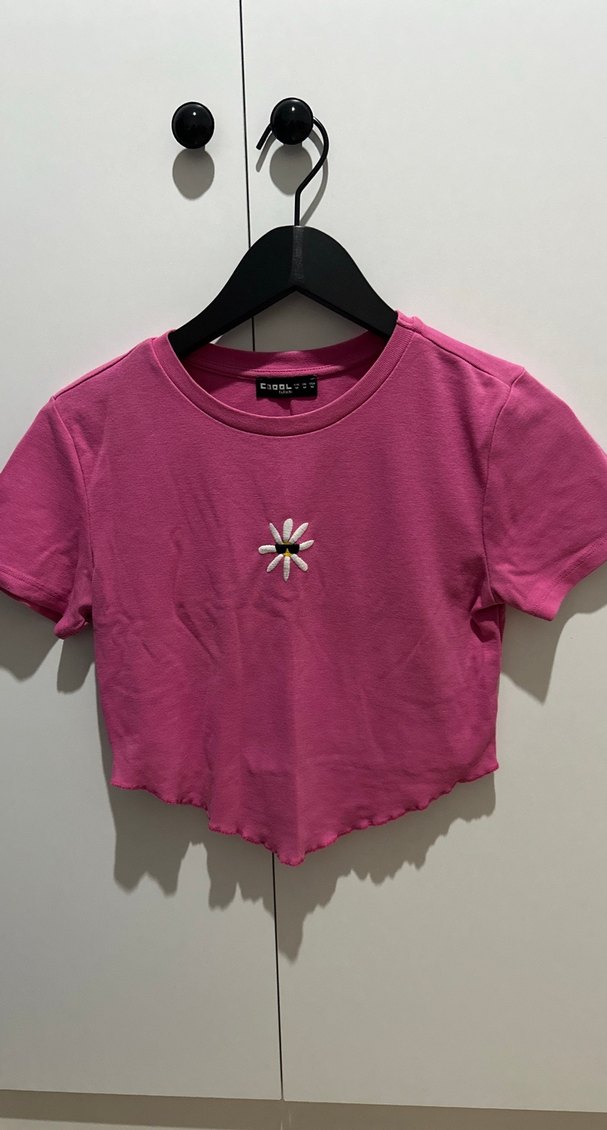 Kısa kollu, yuvarlak yaka pembe tişört, fitted kesim ve Küçük baskılı papatya motifi bulunur. M beden yazıyor fakat S beden uyumludur.