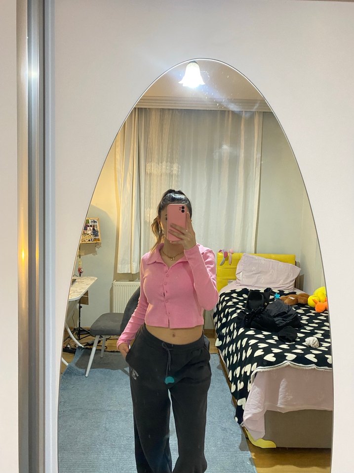 Pembe, uzun kollu ve yüksek yakalı crop top. Düz ve desensiz tasarımıyla gündelik sokak stiline uyum sağlar. Plastik benzeri materyalden, zahmetsiz şıklık sunar.